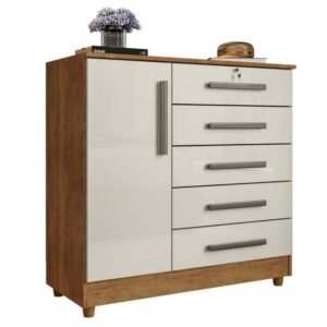 3{%%}Descrição{%%}Cômoda Vitória com 5 Gavetas e 1 Porta Cedro/Areia com Pés Rud Rack