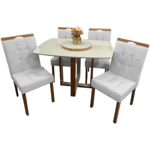 Mesa Atlas Mel/Off White Canto Barril 120×90 com 4 Cadeiras Sophia Mel/Linho Cinza Prata 206 – ART ASSENTOS + WM DECOR