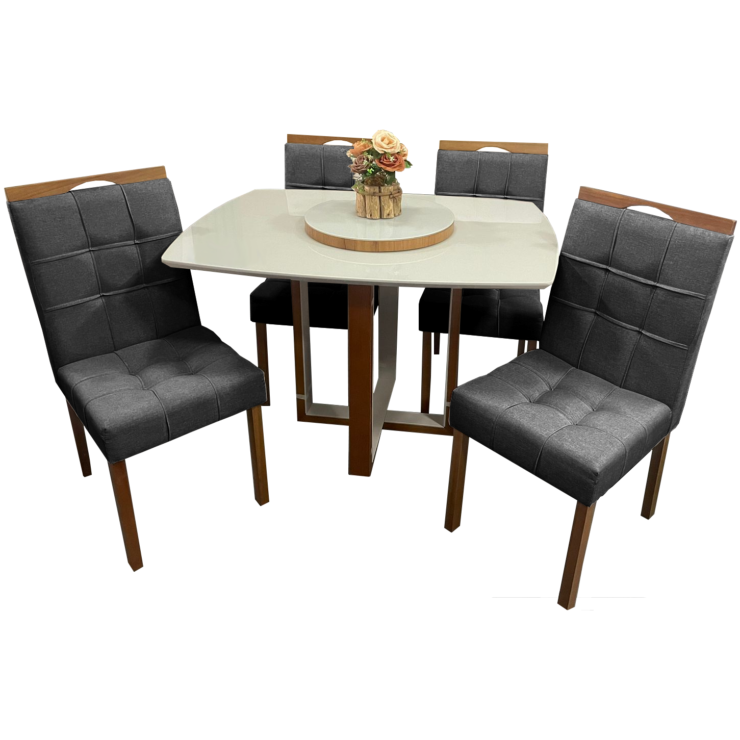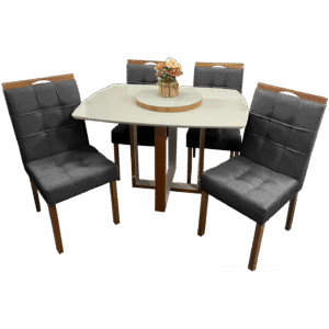 Mesa Atlas Mel/Off White Canto Barril 120×90 com 4 Cadeiras Sophia Mel/Veludo Cinza Grafite – ART ASSENTOS + WM DECOR