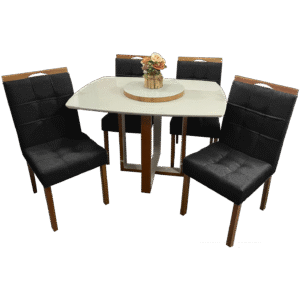 Mesa Atlas Mel/Off White Canto Barril 120×90 com 4 Cadeiras Sophia Mel/Veludo Preto – ART ASSENTOS + WM DECOR