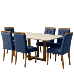 Mesa Atlas Mel/Off White Canto Copo 160×80 com 6 Cadeiras Sophia Veludo Azul – ART ASSENTOS + WM DECOR