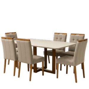 Mesa Atlas Mel/Off White Canto Copo 160×80 com 6 Cadeiras Sophia Veludo Bege – ART ASSENTOS + WM DECOR