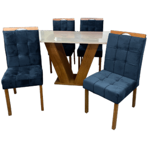 Mesa Classic 120 Cinamomo/Off White com 4 Cadeiras Sophia Mel/Veludo Azul – CEL MÓVEIS + WM DECOR