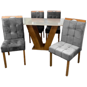 Mesa Classic 120 Cinamomo/Off White com 4 Cadeiras Sophia Mel/Veludo Cinza Grafite – CEL MÓVEIS + WM DECOR