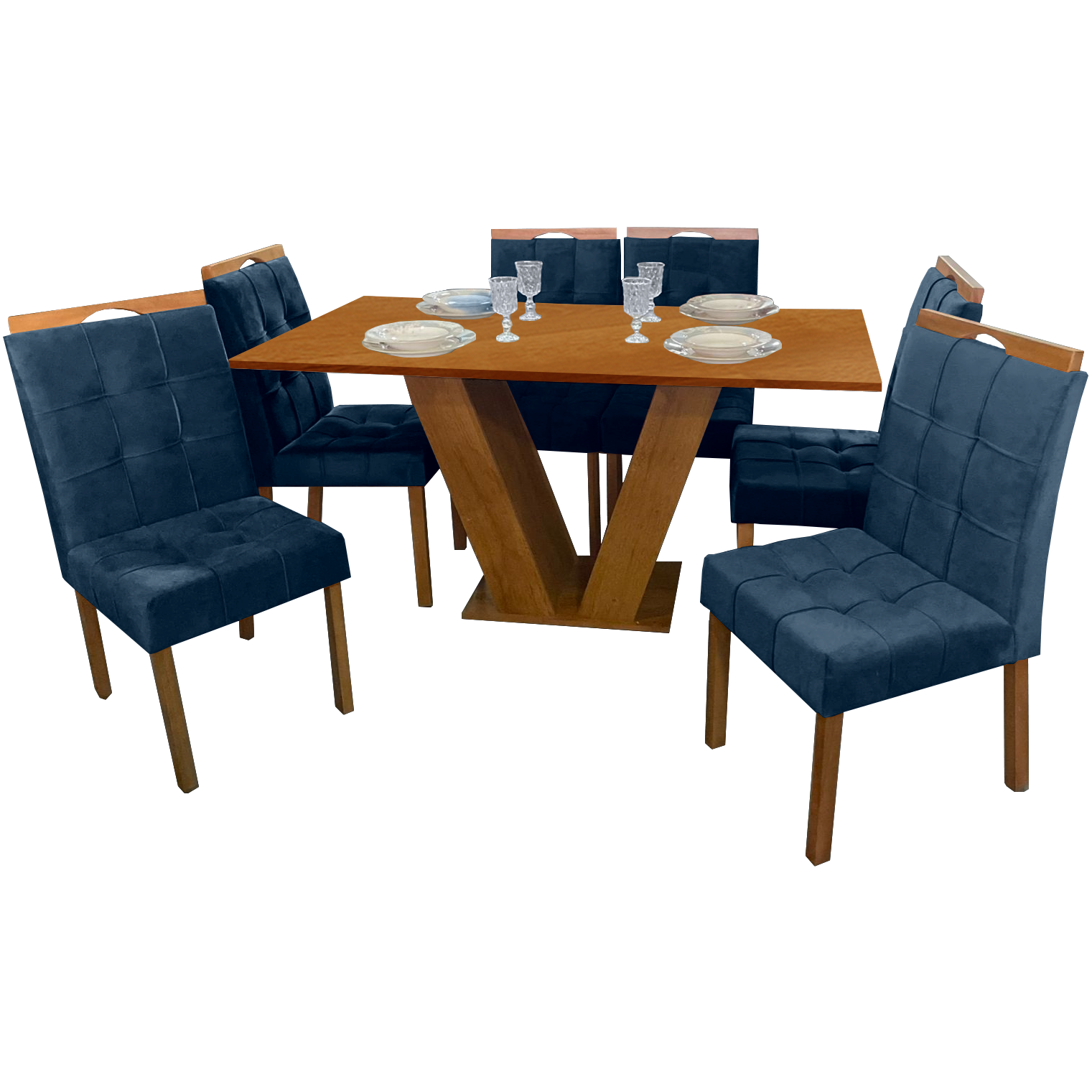 Mesa Classic 160 Cinamomo Laminado com 6 Cadeiras Sophia Mel/Veludo Azul – CEL MÓVEIS + WM DECOR