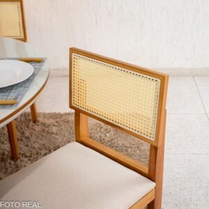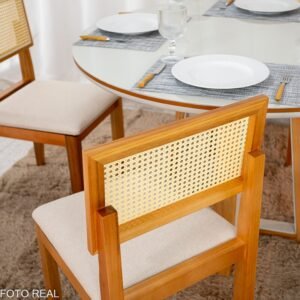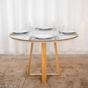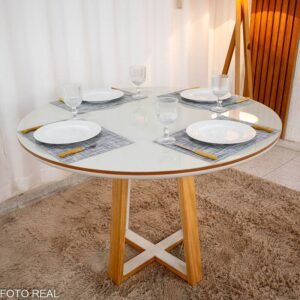 3{%%}Descrição{%%}Mesa de Jantar Atlanta Redonda 120cm Cinamomo/Vidro Off 4 Cad. Santorini Linho Bege Madeira Maciça – Minas Plac