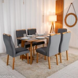 3{%%}Descrição{%%}Mesa de Jantar Dubai Tampo Londres Cinamomo 160×80 6 Cadeiras Genova Veludo Cinza 507 Madeira Maciça