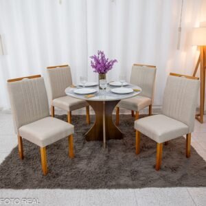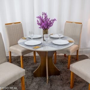 3{%%}Descrição{%%}Mesa de Jantar Siena Redonda 100cm Vidro Off/Base Cinamomo + 4 Cad. Atlanta Linho Bege Cru Madeira Minas Plac – Entregue Montada