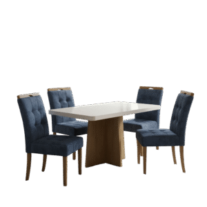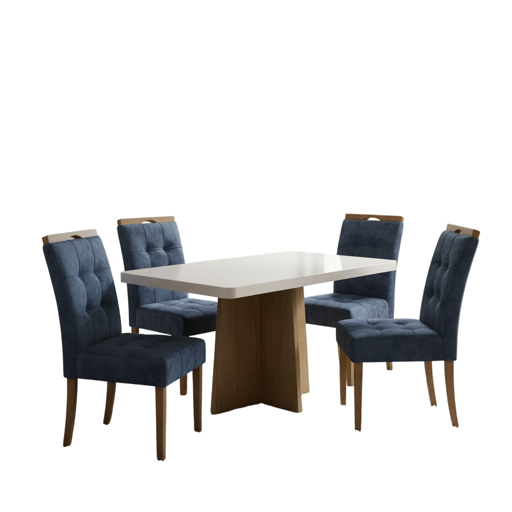 Mesa Jade 120 (Tampo 40 mm) Cinamomo/Off White com 4 Cadeiras Sophia Veludo Azul – VALDEMÓVEIS + WM DECOR