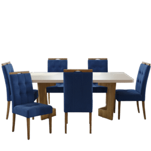 Mesa Liz 160 (Tampo 40 mm) Cinamomo/Off White com 6 Cadeiras Sophia Veludo Azul – VALDEMÓVEIS + WM DECOR