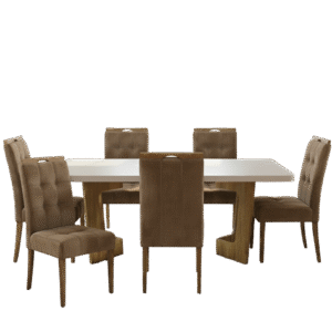 Mesa Liz 160 (Tampo 40 mm) Cinamomo/Off White com 6 Cadeiras Sophia Veludo Marrom – VALDEMÓVEIS + WM DECOR
