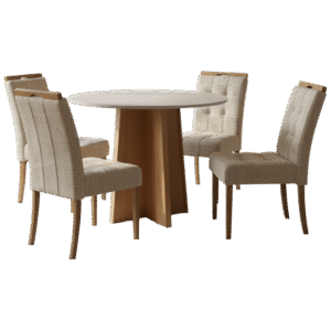 Mesa Redonda Celebrare 100 Amêndoa Clean/Off White com 4 Cadeiras Sophia Linho Bege 200 – LOPAS + WM DECOR