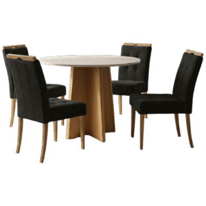 Mesa Redonda Celebrare 100 Amêndoa Clean/Off White com 4 Cadeiras Sophia Veludo Preto – LOPAS + WM DECOR