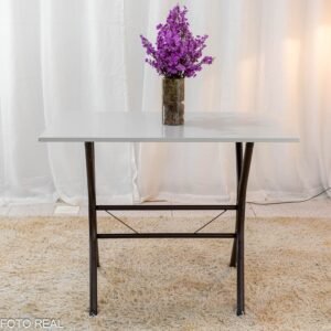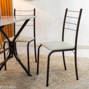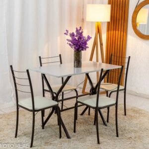 3{%%}Descrição{%%}Mesa Rio Base Cabo Frio Marrom Tampo Pedra Off 100×60 4 Cadeiras Assento Creme – Teixeira