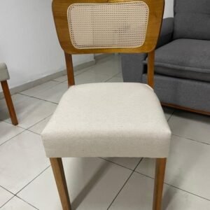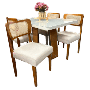 Mesa Sintonia (Tampo Maxi) 120 Amêndoa Clean/Off White com 4 Cadeiras Alasca Linho Bege – LOPAS + HR MOVELARIA
