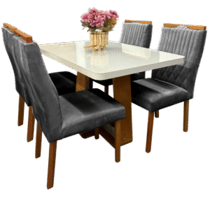 Mesa Sintonia (Tampo Maxi) 120 Amêndoa Clean/Off White com 4 Cadeiras Gênova Veludo Grafite – LOPAS + ART ASSENTOS