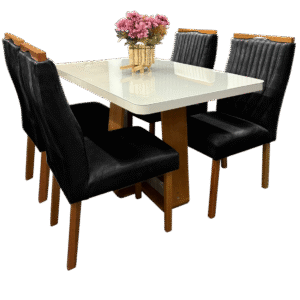 Mesa Sintonia (Tampo Maxi) 120 Amêndoa Clean/Off White com 4 Cadeiras Gênova Veludo Preto – LOPAS + ART ASSENTOS