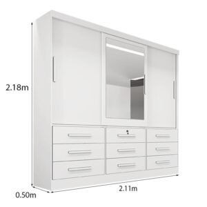 3{%%}Descrição{%%}Roupeiro Casal Turim Branco 3 Portas 9 Gavetas C/ 1 Espelho 100% MDF Larg. 2.11 – Bianchi
