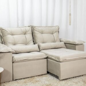 3{%%}Descrição{%%}Sofá Retrátil Reclinável Grécia 2.00m Veludo Bege – Sem caixa