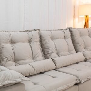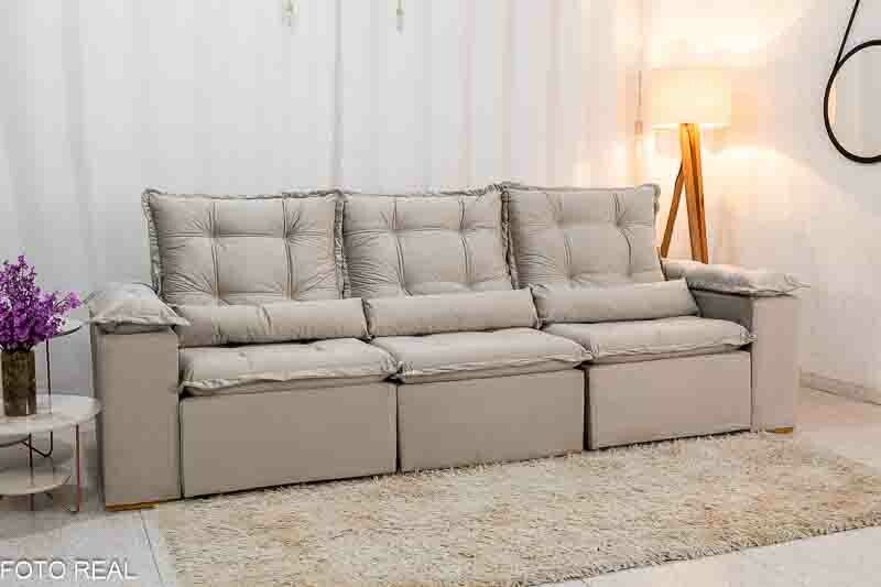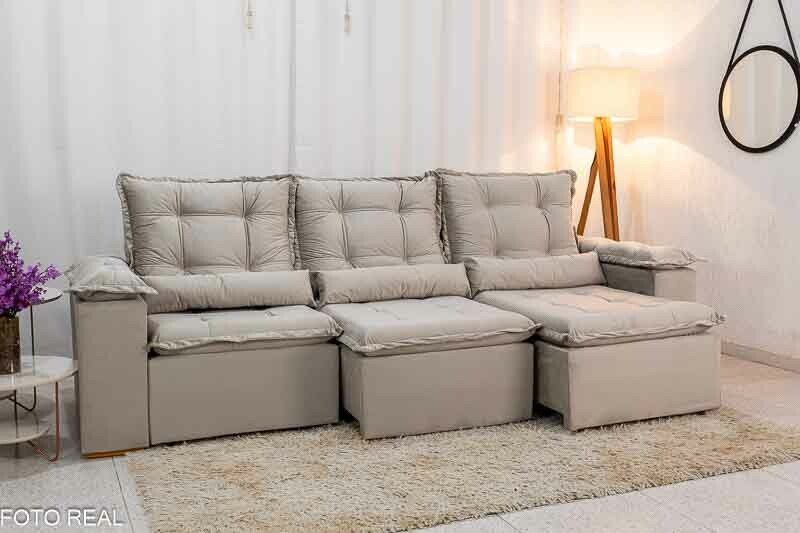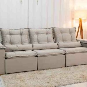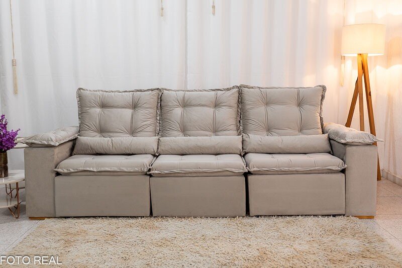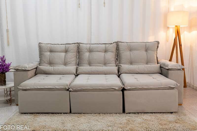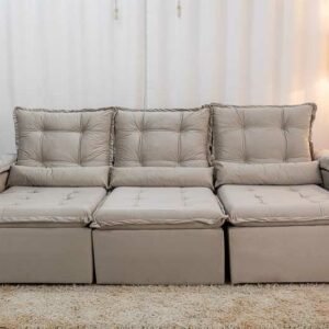 3{%%}Descrição{%%}Sofá Retrátil Reclinável Grécia 2.70m Veludo Bege – Sem Caixa