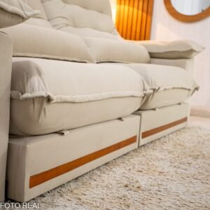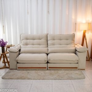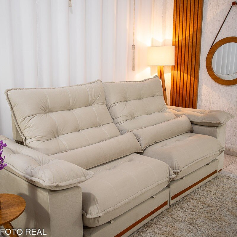 3{%%}Descrição{%%}Sofá Retrátil Reclinável Istambul 2.50m Veludo Bege 406 – Espuma D33