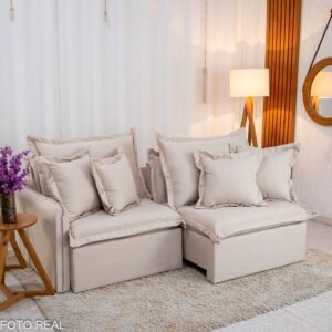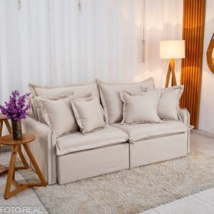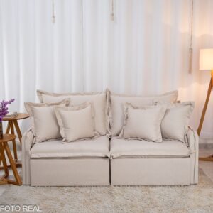 – Tecido linho: O linho possui uma textura naturalmente sofisticada, que confere ao sofá um aspecto elegante e atemporal. Seu visual suave e agradável pode dar um toque de classe à decoração de qualquer ambiente.