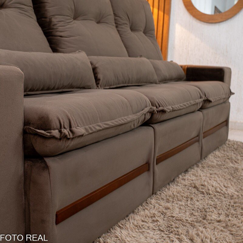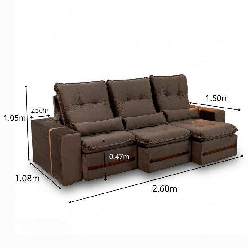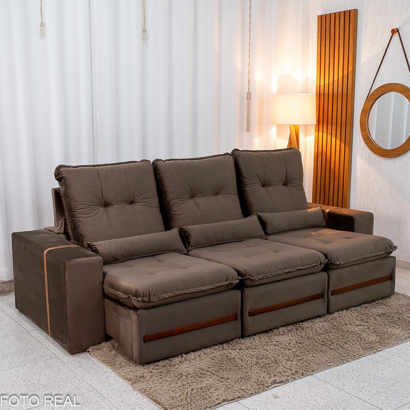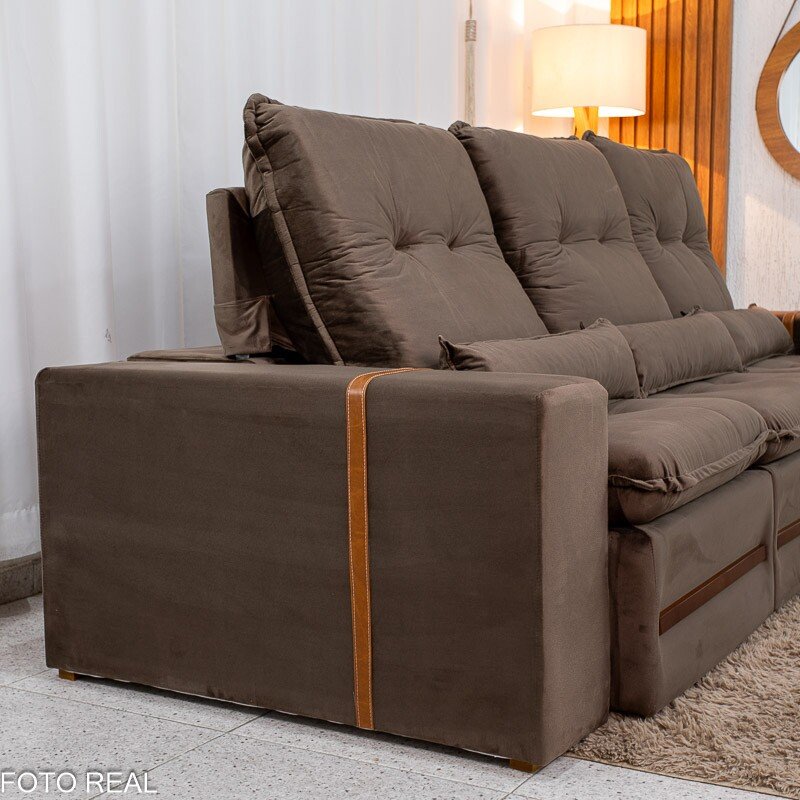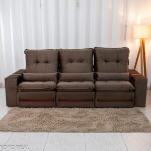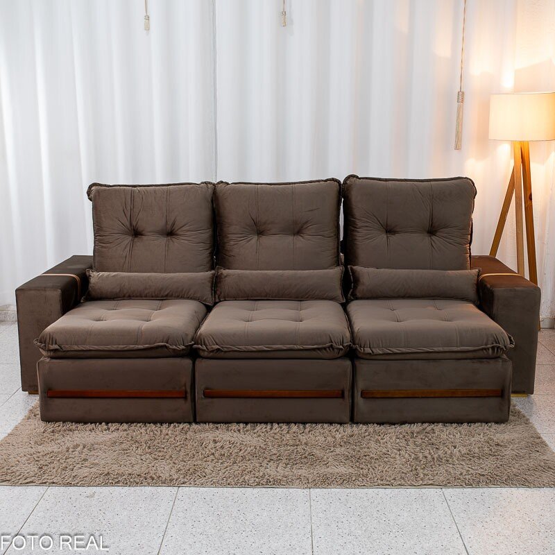 3{%%}Descrição{%%}Sofá Retrátil Reclinável Montreal 2.60m Veludo Marrom – D33