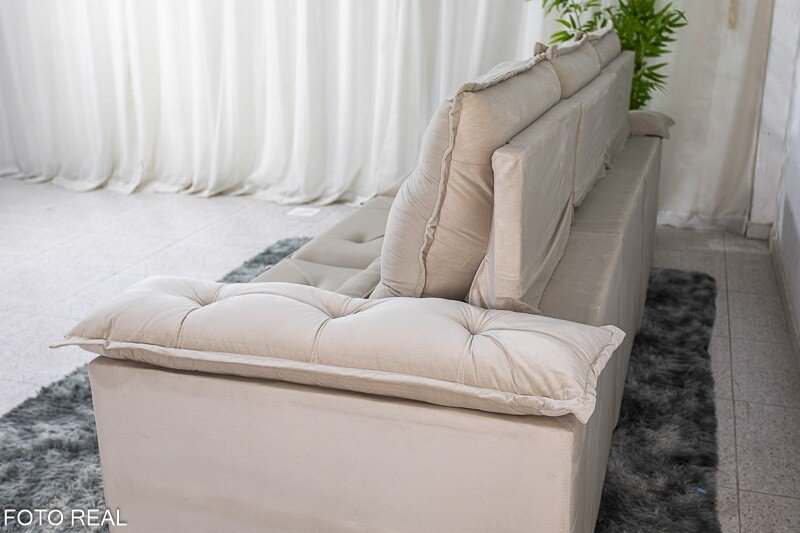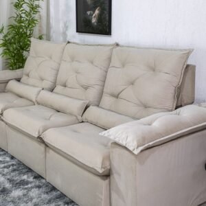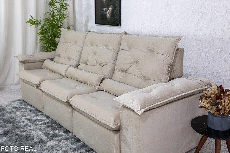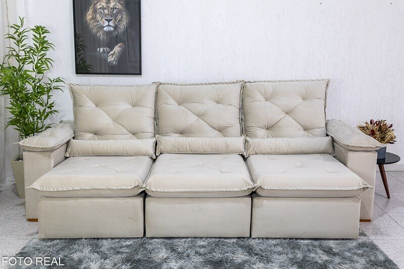 3{%%}Descrição{%%}Sofá Retrátil Reclinável Roma 2.70m Veludo Bege 01 – D28 Soft
