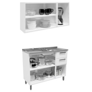 Armário Aéreo 3 Portas 6009590 + Balcão 2 Gavetas 6015590 Múltipla + Tampo Pia Branco – BERTOLINI