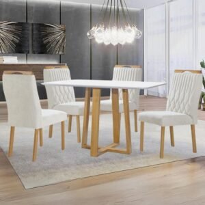 Mesa Pedro 120 Mel/Off White com 4 Cadeiras Gênova Veludo Marfim – ART ASSENTOS