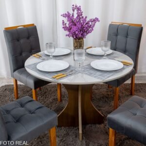 Mesa de Jantar Siena Redonda 100cm Vidro Off/Base Cinamomo + 4 Cad. Londres Veludo Chumbo Madeira Minas Plac – Entregue Montad